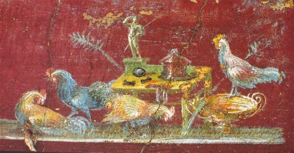 Aves cebadas, ubres de cerda, una liebre con alas sobre el costado, figurando un Pegaso. Advertimos también en los ángulos de la enorme bandeja cuatro sátiros, de cuyos pellejos caía garum con pimienta sobre los peces, que nadaban como en un estanque.