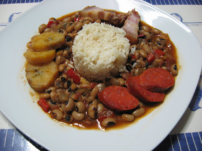 Se remojan los frijoles de un día para otro, se cuelan y se desecha el agua. Luego se coloca en una olla con el caldo de pollo o res, el agua , la hoja de laurel y el trozo de tocineta, a fuego medio hasta que ablanden (una hora aproximandamente). En un sartén se coloca aceite y se sofríe la cebolla, el pimiento, y los ajos, luego cuando la cebolla este transparente añadimos el tomate.Todo esto se sofríe por 5 o 10 minutos. Cuando los frijoles estén blandos se le agregan el sofrito, el plátano, el chorizo y el comino se cocinan a fuego bajo por 20 minutos y se acompañan con arroz blanco